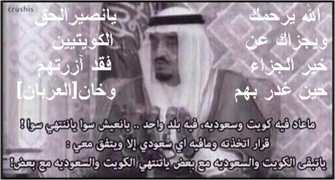 وبالمناسبة تجدرالاشارة والاشادة بالتضامن الخليجي ، وبعض العرب مع الحق الكويتي ، وفي المقدمة منهم ، المملكة العربية السعودية في الملك عهد فهد بن عبد العزيز وولي العهد عبد الله بن عبد العزيز ( رحمهما الله وجميع أموات المسلمين ) حيث فتحت السعودية وبسطت أرضها لإستقبال مَن توجه لها من الكويتيين ، ولتجميع القوات الأُممية التي احتشدت هناك من أجل تحرير الكويت ، حتى بدأت انطلاقة شرارة عاصفة الصحراء ( الأُممية ) ، وتم – بفضل الله ثم الاجماع العالمي - تحرير الكويت ودحر الغزاة العراقيين ، في يوم 26 – 2 -1991م .